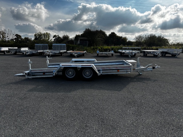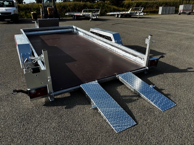 Muni de 2 essieux 1800 kg Alko- Chassis galvanisé à chaud et totalement mécano soudé, fond bakélisé en bouleau finlandais. Le basculement se fait via une pompe hydraulique électrique protégé dans un coffre- Afin d’assurer une pente si faible, le plateau est prolongé par des rampes.